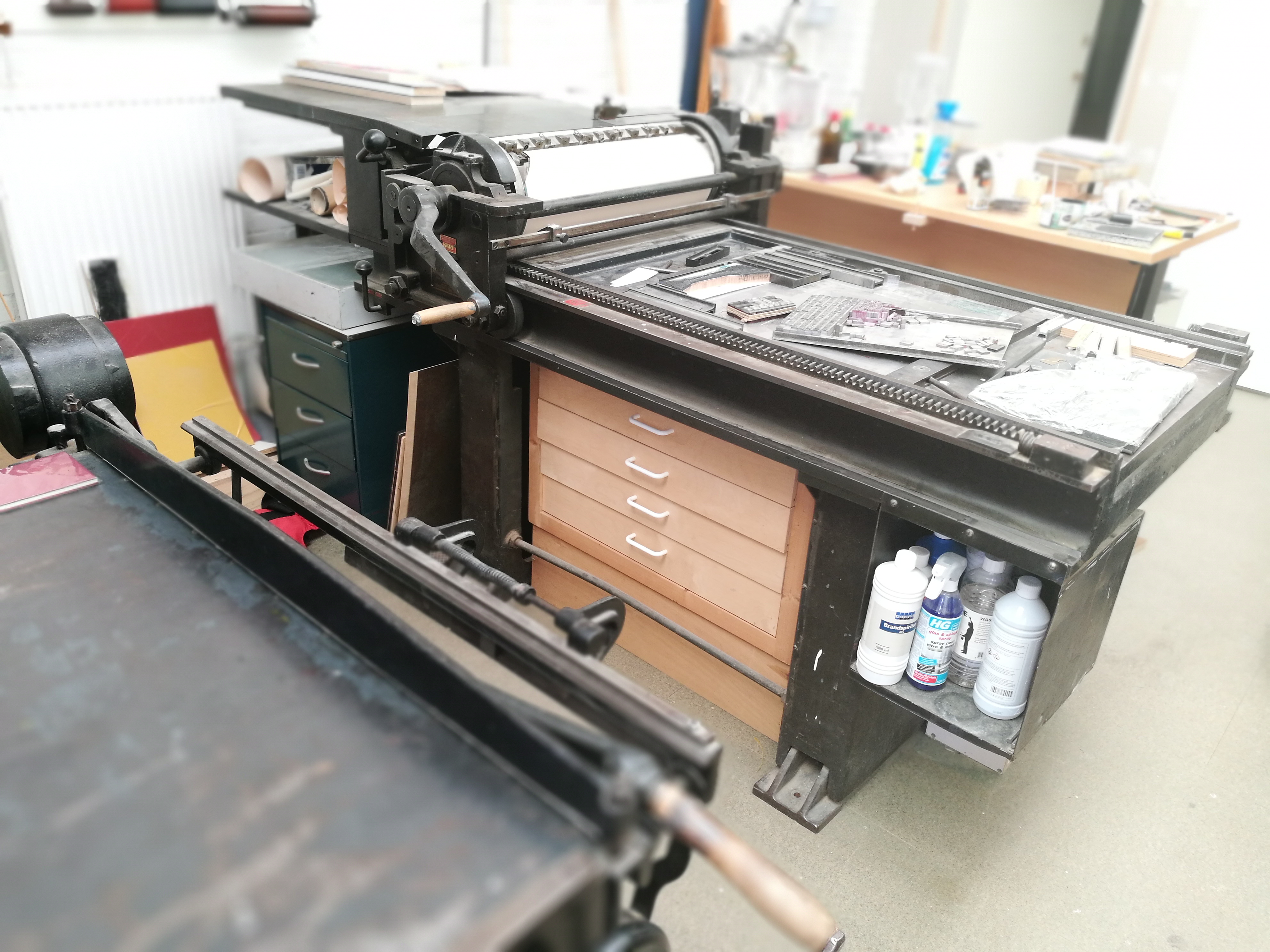 Linoleumsnedes, letterzetten, posters maken met hoogdruk. Het kan in onze werkplaats. Zelfs op het formaat van een krantenpagina. Lekker offline werken, met stoere zware machines van gietijzer, loden letters, grote houten letters en afbeeldingen die je zelf maakt. De drukpers op de afbeelding is een professionele proefdrukpers uit ongeveer 1930. Een van de drukpersen waar […]